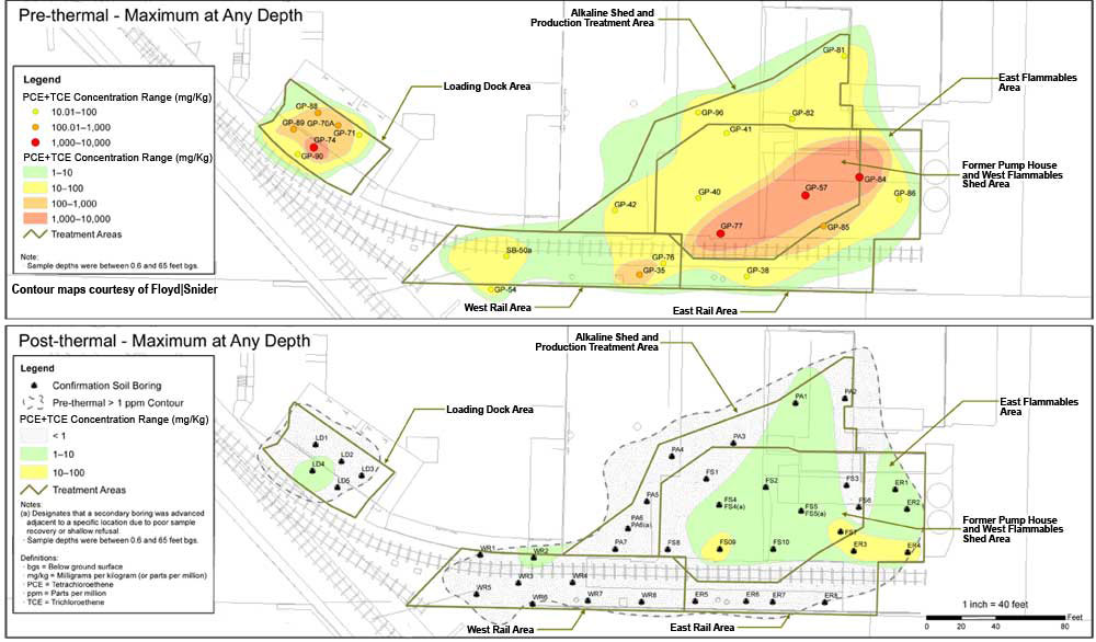 Performance evaluation indicated ERH treatment removed approximately 10,000 pounds of chlorinated solvents and over 19,000 pounds of mineral spirits, based on pre-ERH estimates. Of the mineral spirits, 10,330 pounds of TPH was removed through the GAC vessels and 9,230 pounds of TPH was destroyed through the thermal oxidizer. During the 4.2 months of ERH operations, the average combined PCE and TCE concentration in soil decreased from an average of 141 mg/kg to 0.53 mg/kg, a 99.9% removal of estimated mass in the source area (Figure 5). As expected, the remaining PCE and TCE exist in the area exhibiting the highest pre-ERH concentrations (Figure 6). Limited sampling at one location also indicated an unexpectedly high (65%) reduction in PCP concentrations in soil. Although ERH implementation focused on soil remediation, it also reduced PCE + TCE concentrations in groundwater by about 90% immediately following active heating, with further reductions observed in subsequent months during the cool-down phase.