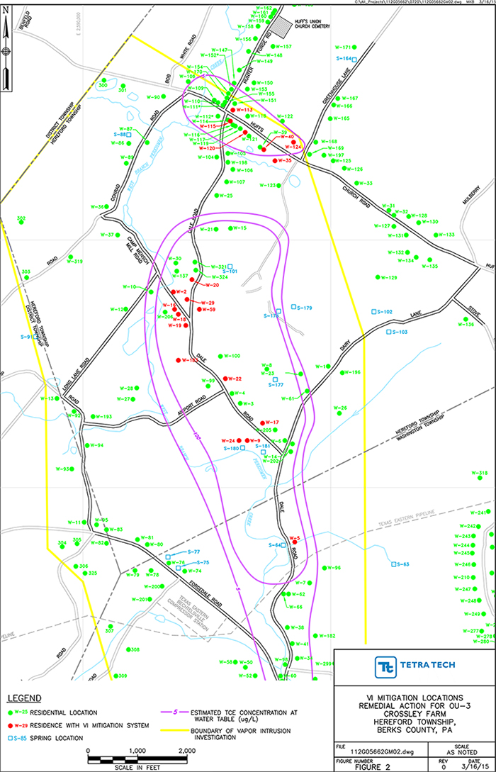 Follow-on vapor intrusion evaluations at other residences have utilized a three-pronged approach involving analysis of groundwater samples taken from wells and springs, soil vapor samples from the sub-slab of residences and indoor air samples from within residences. The groundwater samples are used to define the local groundwater conditions near the water table in order to evaluate if vapor intrusion is a potential concern. The sub-slab samples were used to determine if VOC vapors from the plume have migrated toward the houses. Results were used to evaluate the extent (if any) to which the sub-slab vapors are migrating into the residence. The results were used to determine whether vapor intrusion could reasonably be expected to threaten human health, defined as an excess cancer risk of greater than 1E-5 (one additional chance in 100,000) or a hazard index of greater than 1 (based on target organ effects). Human health risks were calculated using the actual indoor air concentrations, and/or the sub-slab concentrations, assuming an attenuation factor across the slab of 0.1. In general, 26 of the 39 VOCs (including TCE) that exist in source area groundwater were also detected in sub-slab vapor throughout the extent of the plume. Based on the multiple lines of evidence, vapor intrusion mitigation systems were required at 20 of the 39 residences where sampling was conducted. The multiple lines of evidence consist of: 1) the presence of VOCs in contaminated groundwater underlying the residence (the potential for vapors to exist); 2) the presence of VOCs in the sub-slab vapor samples (proof that the VOCs are partitioning into the vapor phase and migrating to the surface); and 3) direct measurements (indoor air samples) or indirect measurements (sub-slab samples with attenuation factor) to show that vapors exist (or have the potential to exist) at concentrations that are not protective of human health.
