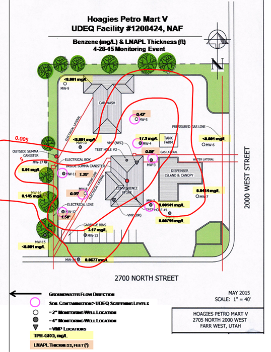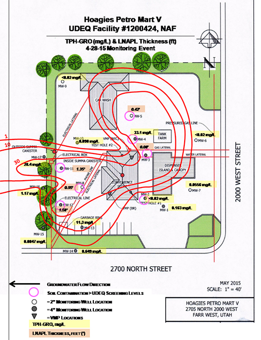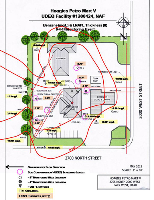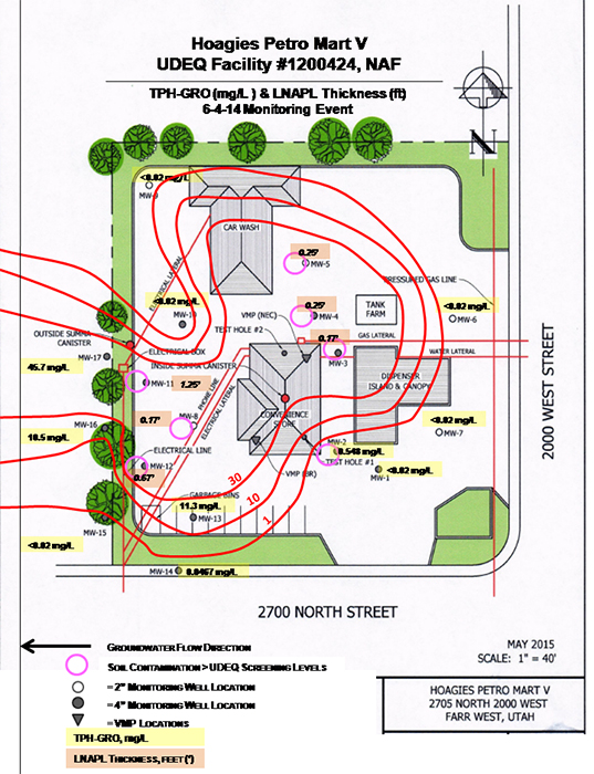 Results from the initial sampling of soil and groundwater indicated that five of the monitoring wells (MWs) located closest to the fuel dispenser island and convenience store – MW-2, MW-3, MW-4, MW-5 and MW-8 – contained BTEX and TPH-GRO levels exceeded Initial Screening Levels (ISLs) and Utah's Tier 1 Screening Criteria1 (Table 1). Contaminant concentrations exceeding both screening criteria for soil were found at depths ranging from 9 to 30 bgs. A total of 29 soil samples were collected, with benzene exceeding Tier 1 criteria in nine samples, toluene in seven samples, ethylbenzene in three samples, and TPH-DRO in three samples.