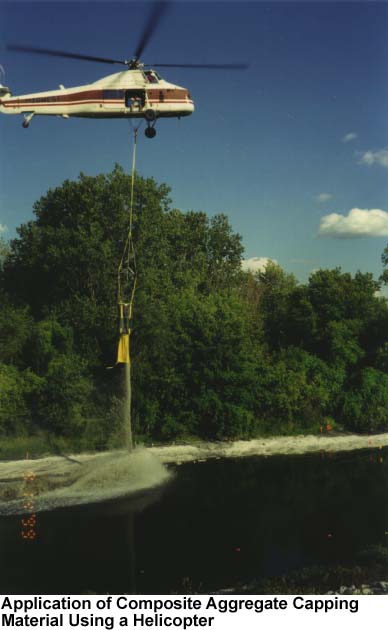 Various installation techniques also were demonstrated as part of the project. Following geogrid installation from workboats, approximately 364, 82, and 15 tons of composite aggregate were installed using telescoping conveyor, helicopter, and dragline delivery systems, respectively. An additional 206 tons of approximately one-inch stone then were installed by the conveyor and helicopter to finish construction of the stone-covered cap. Spatial uniformity of capping material applications was observed closely during cap installation to ensure that an adequate degree of coverage was achieved through each of the application techniques.
