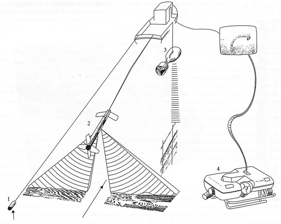 Figure 5. A conceptual schematic of integrated marine survey instrumentation configured for an archaeological survey where, magnetics (1), sidescan sonar (2), sub-bottom profiler (3), and a remotely operated vehicle (4) are illustrated (Bowens 2009).