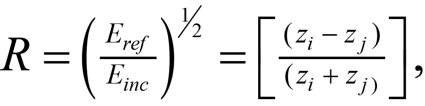 At the highest boundary, the water-bottom interface, z j ,water is known to be 1.5 * 10 9 g/(m 2 s). Since the E ref l , 1-2 can be determined, and E inc , 1-2 and z 1,water are known, z i , 2 may be determined. V P , 2 may be assessed from the depth of the 2-3 boundary, and thus ? i , 2 may be resolved. The material properties of lower units can be found in succession from the reflections of deeper layers.