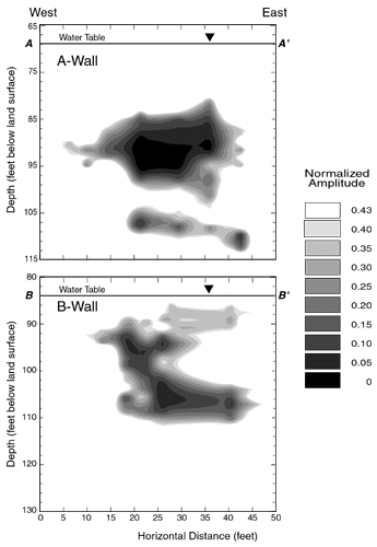 Field results indicated that Cr(VI) concentrations dropped from pre-treatment levels of 2.2-5.0 mg/L to non-detect levels within 60 hours of injection and remained at virtually the same level throughout the remaining course of the pilot projects 48-week monitoring period. Data showed that byproducts of the redox process (sulfate and dissolved iron) significantly increased during the initial 60-hour period but decreased to original levels approximately 32 weeks after the injection phase. Similarly, other process indicators such as pH and specific conductance initially rose but returned to or near original levels within approximately 48 weeks, which is typical of the redox process. Pumping and treatment of the injected material was not required because sodium dithionite is known to produce no adverse side effects or byproducts. Costs for the pilot project totaled approximately $750,000, including expenses for soil excavation in the upper area of the treatment zone. Comparative analysis estimated that the addition of chemical injections for source control at the Support Center site helped to reduce the overall project (including mobile plume treatment through the PRB) costs by 40 percent and the cleanup time by 28 years. In comparison to conventional pump and treat methods, analysis estimated that this combined approach for source control and plume treatment achieved nearly an 80 percent reduction in costs. More information on the pilot study is available on the Internet at www.epa.gov/ORD/NRMRL or from Cynthia Paul (National Risk Management Research Laboratory) at 580- 436-8556 or e-mail paul.cindy@epa.gov. Cross-Hole Radar Method Monitors PRB Installationby Jennifer G. Savoie, John W. Lane, Jr., and Peter K. Joesten, U.S. Geological Survey The U.S. Geological Survey (USGS), in cooperation with the U.S. Air Force Center for Environmental Excellence (AFCEE), conducted a study using cross-hole, common-depth radar scanning to determine the lateral and vertical extent of permeable reactive barriers (PRBs) installed near the Chemical Spill-10 (CS-10) source area at the Massachusetts Military Reservation (MMR) on Cape Cod, MA. The study also enabled researchers to determine whether any large holes in the barriers existed that could allow contaminated ground water to pass untreated through the remediation zone. Based on the survey results, researchers were able to determine that the PRBs were installed in the planned locations. Ground water beneath and downgradient from the CS-10 source area has been affected by contaminants such as chlorinated solvents during decades of past military operations. These contaminants entered the ground-water system and continue to move with the ground-water flow in the underlying sand and gravel aquifer toward nearby streams, ponds, and coastal bays. Depth to ground water at the CS-10 source area is about 80 feet below ground surface (bgs), and the ground-water flow rate is estimated at 0.5-1 foot per day. The contaminant of greatest concern is tetrachloroethene, with concentrations at the source area of approximately 250 micrograms per liter. The University of Waterloo in Ontario, Canada, conducted a field trial involving the installation of two demonstration-width, full-depth, granular-iron walls in the path of the ground-water plume. The depth of the plume (80-120 feet bgs) exceeded practical limits for conventional emplacement methods such as trenching. To address this limitation, hydraulic fracturing and injection methods were used to install the walls. In the field, radar surveys were conducted before and after the iron wall installations. Cross-hole radar scans were conducted in 20 boreholes on opposite sides of the walls using a radar system containing electric-dipole antennas with center frequencies of 100 and 250 Megahertz. Radar-scan measurements of the regions between pairs of boreholes were acquired by moving a radar transmitter and receiver in unison at 10-centimeter increments from the tops of casings to the bottoms of the boreholes. As anticipated, the amplitudes of radar waves crossing the iron zones decreased significantly between the pre- and post-installation surveys, indicating the presence of iron. The results of two-dimensional, finite-difference/time-domain numerical modeling based on laboratory-scale physical models were used to interpret changes in radar amplitude observed in the field. The numerical and physical models simulated a wall of perfectly conductive material embedded in saturated sand that was representative of the MMR field conditions. Modeling results indicated that the amplitude of a radar pulse transmitted across the edge of the conductive wall was about 43 percent of one transmitted through background material. Figure 3 shows the transverse sections for the locations of the two iron walls based on radar scanning results. These data indicate that the A-Wall contains two zones: the upper zone is about 33 feet wide, extending 82-102 feet bgs; the lower zone is about 26 feet wide, extending 103-113 feet bgs. The B-Wall is interpreted as a 30 foot-wide continuous zone extending about 89-113 feet bgs. It was determined that no holes existed within the boundaries of either iron wall.
