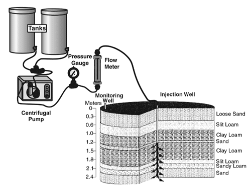 At the peak of operation, vapors from the systems extraction wells reached a level of 6,600 parts per million volume (ppmv). A total of 3 billion standard cubic feet of air at temperatures approaching 200°F was extracted and cooled over the course of operations. The resulting condensate was directed at a rate of 20 gallons per minute to a surface-level separator where the DNAPL (totaling less than five gallons) was removed from water and dispositioned at an onsite waste facility. Almost 160 million standard cubic feet of PCE- and TCE-bearing air was extracted as noncondensable flow and discharged through the attached soil vacuum extraction unit. Factors found to affect the success of DUS application at the M-Area included the: (1) different injection methods required for varying lithologies, (2) site-specific criteria used to determine optimal shut-down points and processes, and (3) inherent difficulties associated with precise measurement of HPO efficiency. Most significantly, product removal rates were found to be limited by the maximum temperature that could be achieved with this closed DUS system. Following a cool-down period of six months, the system will be further examined to measure the completeness of remediation in the target zone. Total costs for this project are estimated at $4.8 million. DUS operations at the M-Area were designed and conducted by Integrated Water Resources, Inc. (based in Santa Barbara, CA) in cooperation with IT Corporation. In addition, technical assistance for the project was provided by Lawrence Livermore National Laboratory through the DOEs Subsurface Contaminants Focus Area (SCFA) Lead Laboratory Support Program. A final project report will be available in early 2002 on the SCFA Web site, www.envnet.org/scfa. For more information, contact Michelle Ewart (DOE) at 803-725-1115 or michelle.ewart@srs.gov, or Jim Kupar (Bechtel Savannah River, Inc.) at 803-952-6525 or james.kupar@srs.gov. Sodium Dithionite Injections Used for Chromium Reductionby Cynthia J. Paul, U.S. EPA/Office of Research and Development/National Risk Management Research Laboratory A field-scale pilot study was conducted in 1999 at the U.S. Coast Guard Support Center in Elizabeth City, NC, to evaluate the effectiveness of injecting sodium dithionite into the upper aquifer and lower vadose zone to create a permeable reactive barrier (PRB) system utilizing naturally occurring iron for hexavalent chromium (Cr) (VI) reduction. Within three days of chemical injection, Cr(VI) concentrations dropped to below the target cleanup levels. Based on these results, a full-scale treatment system employing sodium dithionite injections was implemented earlier this year. Past operations of a chrome-plating shop at the Support Center created a contaminant plume with mixed organic and metal compounds, particularly Cr(VI). Due to indications that chromium in the soils would remain immobile and present no potential risk, initial cleanup efforts focused on treating the diffuse chromium plume. A PRB using zero-valent iron was installed at the site in 1996 and has since proved effective for remediating the mobile chromium plume. A water-main break in the immediate vicinity of the plating shop during 1994, however, caused an artificial rise in the water table directly beneath the shop. As a result, soluble Cr(VI) in concentrations reaching 28.0 mg/L had migrated into the ground water. Although concentrations decreased to approximately 4.4 mg/L by 1997, additional treatment was required to meet the maximum contaminant level of 0.1 mg/L for ground water. The U.S. Coast Guard estimated that additional contaminant release into the mobile plume being treated by the PRB would result in the potential need for replacement of the PRB in approximately 10 years. Based on these findings, immediate treatment of the contaminant source was found more cost effective than eventual replacement of the PRB. Prior to the source control pilot study, steps were taken to re-characterize the site through the collection of soil cores from 32 locations within the plating shop. Preliminary screening was conducted using x-ray fluorescence and inductively coupled plasma spectroscopy to determine total chromium levels. Laboratory batch extractions were conducted to selectively remove Cr(VI) from contaminated soils in order to delineate the extent of the soluble, easily mobilized Cr(VI). Results indicated that the contaminant plume had migrated vertically through a series of sand and silt/clay loam layers into the ground water at 2 meters below ground surface and horizontally toward the Pasquotank River, which is located approximately 60 meters from the source area. These conditions provided a continual release of Cr(VI) into the mobile contaminant plume treated by the PRB. Additional laboratory studies were conducted to better understand the potential for in situ reduction/oxidation (redox) manipulation (ISRM) and to evaluate sodium dithionite (Na2S2O4), l-ascorbic acid (C6H8O6), and free hydroxylamine (FH-50) as potential reductants. Results showed sodium dithionite to be the most effective at reducing chromium with the least adverse side effects. Injecting sodium dithionite into areas with high levels of naturally occurring iron (Fe) was found to create a spatially-fixed reducing zone analagous to a chemical PRB. Through such injection, Fe(III) is reduced to Fe(II) and redox-sensitive contaminants such as Cr(VI) are immobilized or precipitated as they migrate through the reducing zone. In the field pilot, a solution of sodium dithionite (17 kg), potassium bicarbonate (19 kg), and bromide tracer (5.63 kg) in 1,874 liters of distilled and deionized water was injected into ground water at depths ranging from 1.2 to 2.4 meters below ground surface (Figure 2). The reductant was injected continuously for 38 hours at 1 liter/minute. To evaluate the use of ISRM in the capillary fringe areas, test data were collected from the 1-meter treatment area i