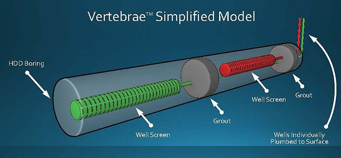 Due to limitations of the borehole size, nested wells are not common with HDD, but applications do exist. For example, three 2-inch-diameter oxygen injection wells were installed within a horizontal boring at the Escambia Wood–Pensacola Superfund siteAdobe PDF Logo. The screened intervals were isolated by installing Portland cement/bentonite seals via a tremie pipe during pullback of the casing. In addition, the Vertebrae™ nested well systemAdobe PDF Logo allows for multiple small-diameter (approximately ½ inch) screens to be used in HRWs for injection or sparging. Each screen is separated by a bentonite and Portland cement seal, which is injected in the intervals between the screens.
