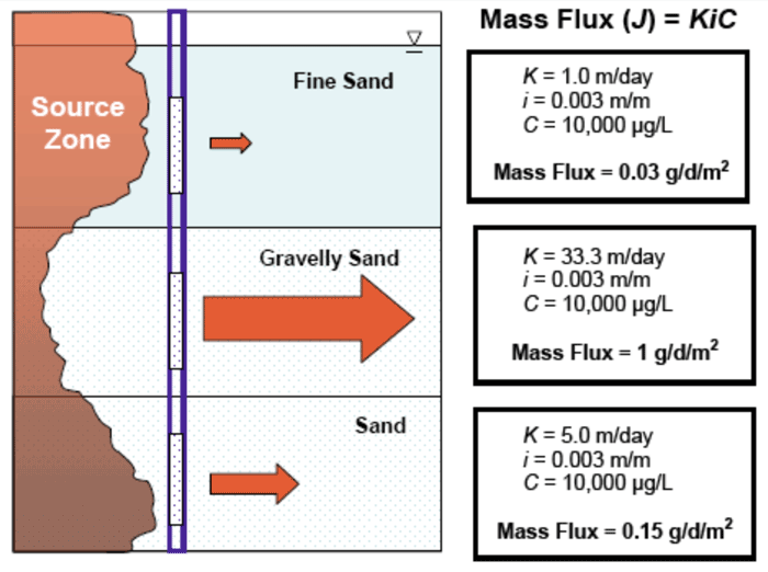 On the other hand, concentrations and gradient may be the same, but as illustrated in Figure 2, the hydraulic conductivity of a given unit can cause the flux and mass discharge to be considerably different.
