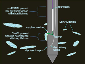 Because chlorinated solvents do not generally contain components that fluoresce, the DyeLIF™ system introduces an aqueous delivery fluid containing a hydrophobic dye through a small injection port that is situated 22 cm below the LIF window. When DNAPL is present, the dye will partition into it in less than one second. The fluorescent response of the solvated dye is much more intense and is distinct from that of the unsolvated dye. The response is monotonic; more fluorescence equates to higher pore saturation of DNAPL.