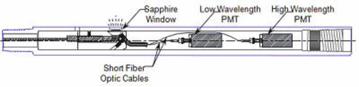 A pulsed laser is used to excite the dye. The light is transmitted via fiber optics to a sapphire optical window that illuminates the adjacent soil. Both reflected laser light (scatter) and any fluorescence is reflected by a mirror and sent to a spectrometer at the surface. A filter in the entrance of the instrument blocks the majority of the relatively intense laser light being scattered into the detector from the soil in front of the downhole window. Four fiber optic fibers inside the instrument are used to delay four wavelengths of fluorescence by ~50 ns with respect to each other, before delivering them to the detector, resulting in a multi-wavelength waveform data form.