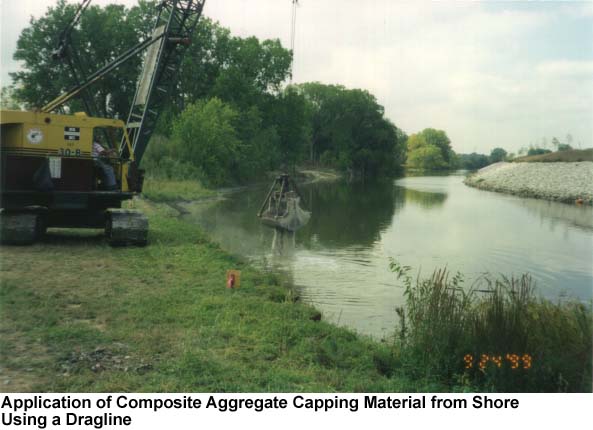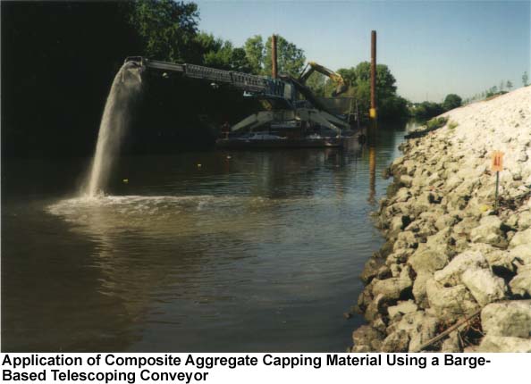 Three sediment caps of different design were installed along a 2.5-acre section of the river: a composite aggregate, exclusively; a basal geogrid component overlain by composite aggregate; and a geogrid plus composite aggregate and surficial stone layer. Target hydrated cap thicknesses range from approximately 5-6 inches for the first two cap designs and approximately 5-8 inches for the design incorporating a surficial stone layer. Various installation techniques also were demonstrated as part of the project. Following geogrid installation from workboats, approximately 364, 82, and 15 tons of composite aggregate were installed using telescoping conveyor, helicopter, and dragline delivery systems, respectively. An additional 206 tons of approximately one-inch stone then were installed by the conveyor and helicopter to finish construction of the stone-covered cap. Spatial uniformity of capping material applications was observed closely during cap installation to ensure that an adequate degree of coverage was achieved through each of the application techniques.