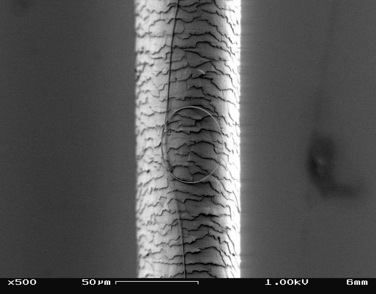 Figure 1. Micrograph of a looped nanowire against the backdrop of a human hair (Mazur Group 2008)